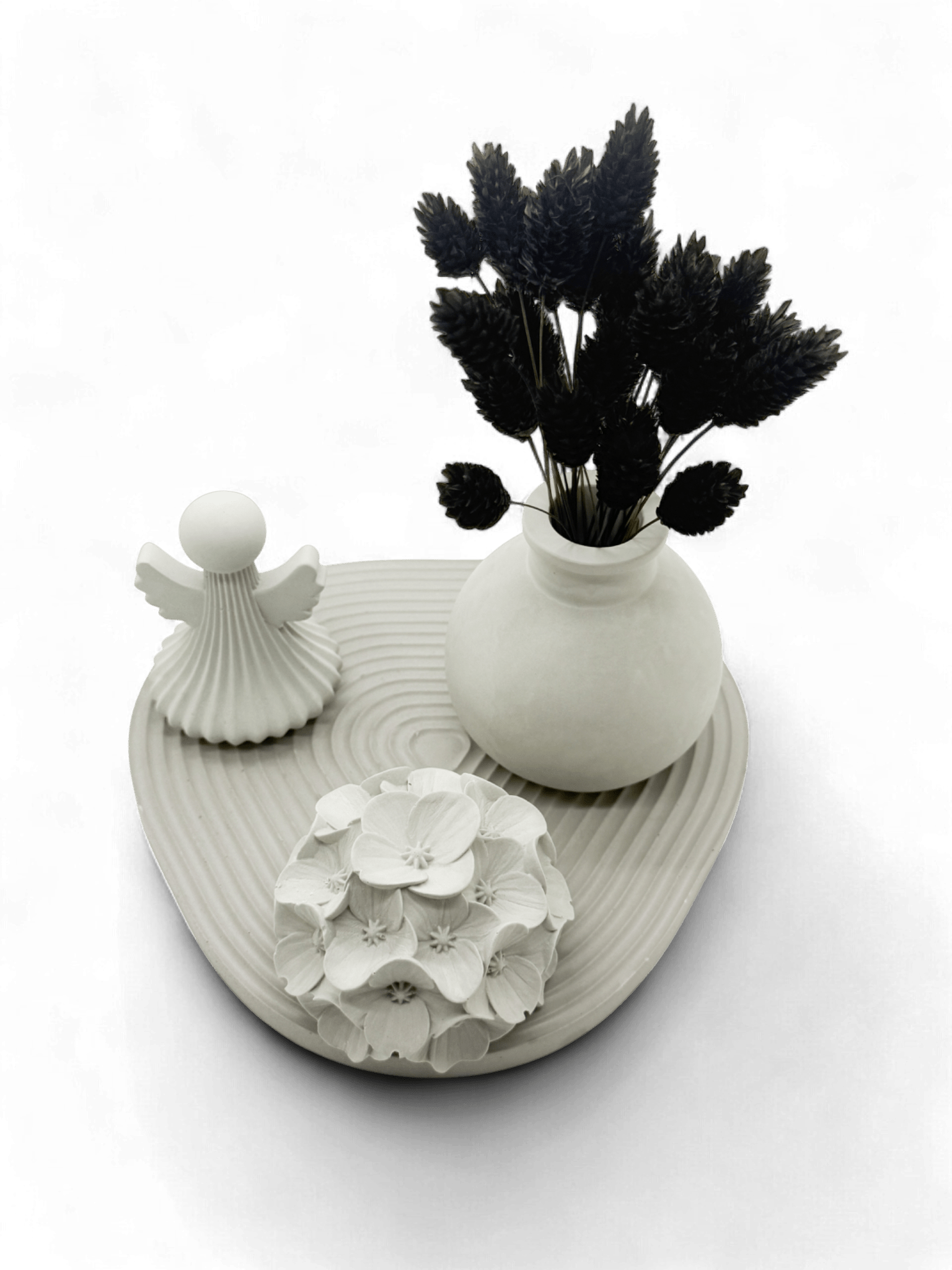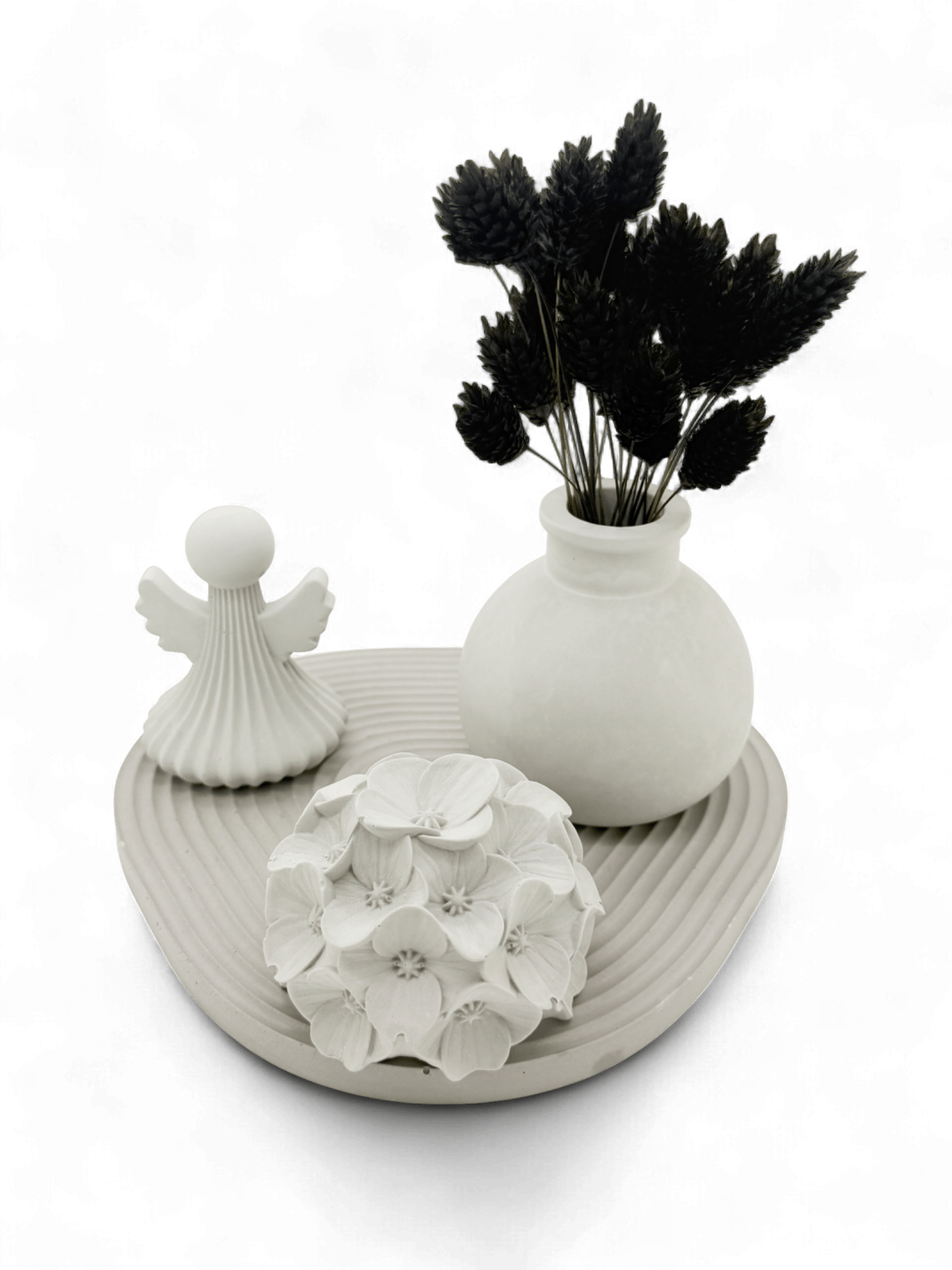 Een zorgvuldig samengestelde woonset in elegante grijstonen die direct rust en balans brengt in je interieur. De accessoires zijn vervaardigd uit stevig, mat materiaal en hebben vormen die eenvoudig maar stijlvol zijn — ontworpen om samenhang te creëren zonder opdringerig te zijn.