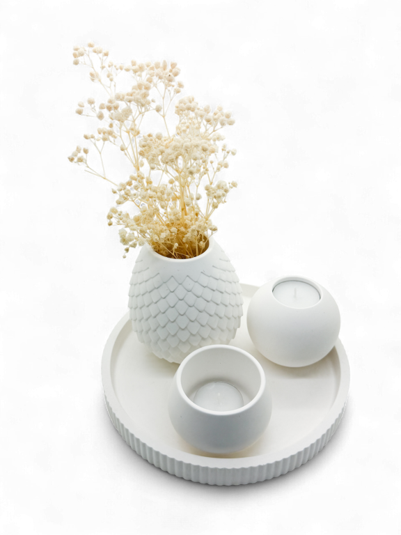 Laat je interieur baden in de zachte, mysterieuze gloed van de nachtlucht met Moonlight Whisper. Deze set combineert tinten zoals staal-blauw, zilvergrijs en matzwart met accenten van glanzend metaal of spiegelend glas. Samen vormen ze een sfeer van rust, diepgang en elegantie — perfect voor rustige avonden binnenshuis of een rustige hoek waar je tot jezelf wilt komen.