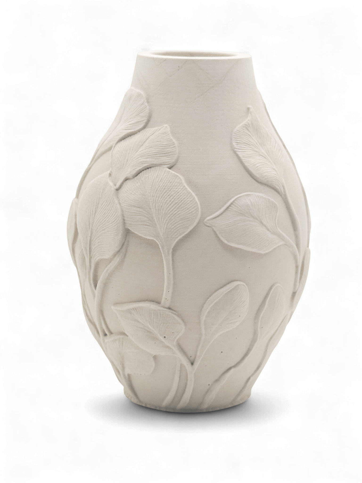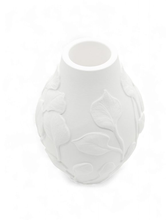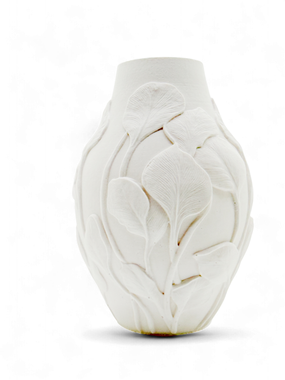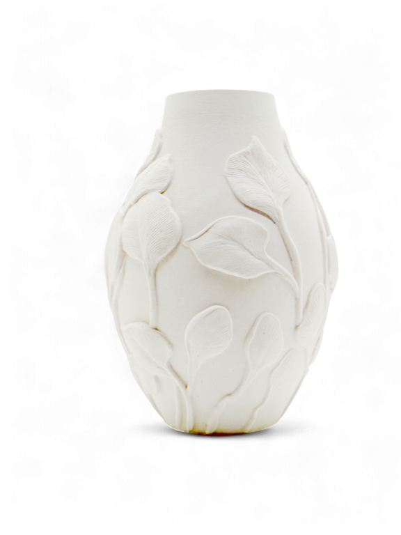 Leaf Veil is een vaas met een decoratief motief van bladeren in reliƫf dat elegantie en natuur combineert. Het materiaal is hetzelfde stevig, mat afgewerkte type als bij de andere woonaccessoires van Hadiah, waardoor hij warmte en karakter toevoegt zonder overdaad.